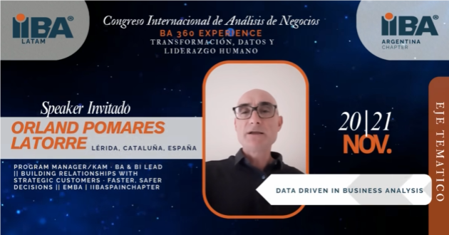 Participación de IIBA® Spain en el I Congreso Anual de IIBA® Argentina Chapter: "BA Experience 360"En el marco del Primer Congreso Anual de IIBA® Argentina Chapter bajo el título "BA Experience 360: Transformación, Datos y Liderazgo Humano", tenemos el placer de comunicar que desde el capítulo de IIBA Spain participaremos muy activamente incorporando tres ponentes de lujo: - Rafa Pagán, presidente de IIBA® Spain Chapter con su ponencia "Liderazgo aumentado por IA: el futuro estratégico del Análisis de Negocio". (Pincha sobre la imagen para ver la publicación y el video) - Raúl Fdez Cuenca, secretario de IIBA® Spain Chapter con su ponencia "IA, Procesos y BABOK®: acelerando el cambio en organizaciones". (Pincha sobre la imagen para ver la publicación y el video) - Orland Pomares, voluntario del Área de Comunicación y Marketing de IIBA® Spain Chapter con su ponencia "El BA como arquitecto de decisiones con datos reales e IA responsable: Menos dashboards, más decisiones". (Pincha sobre la imagen para ver la publicación y el video) El Congreso se celebrará los días 20 y 21 de noviembre y nuestros ponentes participarán en la modalidad virtual. ¡Reserva la fecha y sé parte de esta experiencia única! 🫴 Inscripción Virtual 21 de Noviembre. ¡Os esperamos! ¡Estamos haciendo historia con el Análisis de Negocio en España y eres parte de ello! |