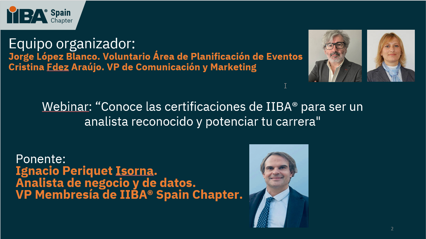 Webinar de presentación de IIBA® Spain Chapter para la comunidad de directores de proyectos de PMI® Galicia Spain Chapter. 28 de Noviembre de 2024En este webinar, la Junta Directiva de IIBA® Spain Chapter, por invitación de PMI® Galicia Spain Chapter, presentó el capítulo de reciente creación de IIBA® Global en España, fundado para poder acercar la labor de IIBA® en la disciplina del Análisis de Negocio a toda la comunidad de analistas de España, en castellano y con mayor agilidad, además de ser un punto permanente de intercambio de conocimiento y experiencias.